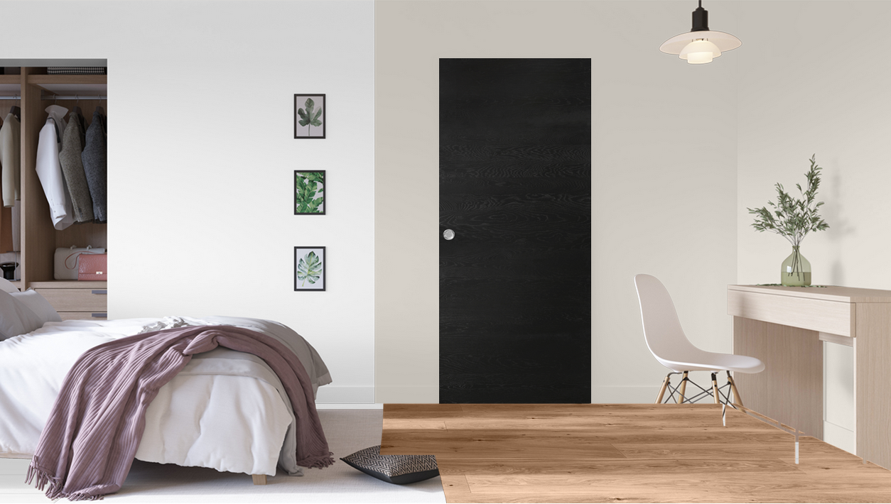 Porte seule EPURE MODULO, 83×204, chêne brossé fini noir foncé RAL9005, avec serrure à clé sans ferrage, sans poignée.