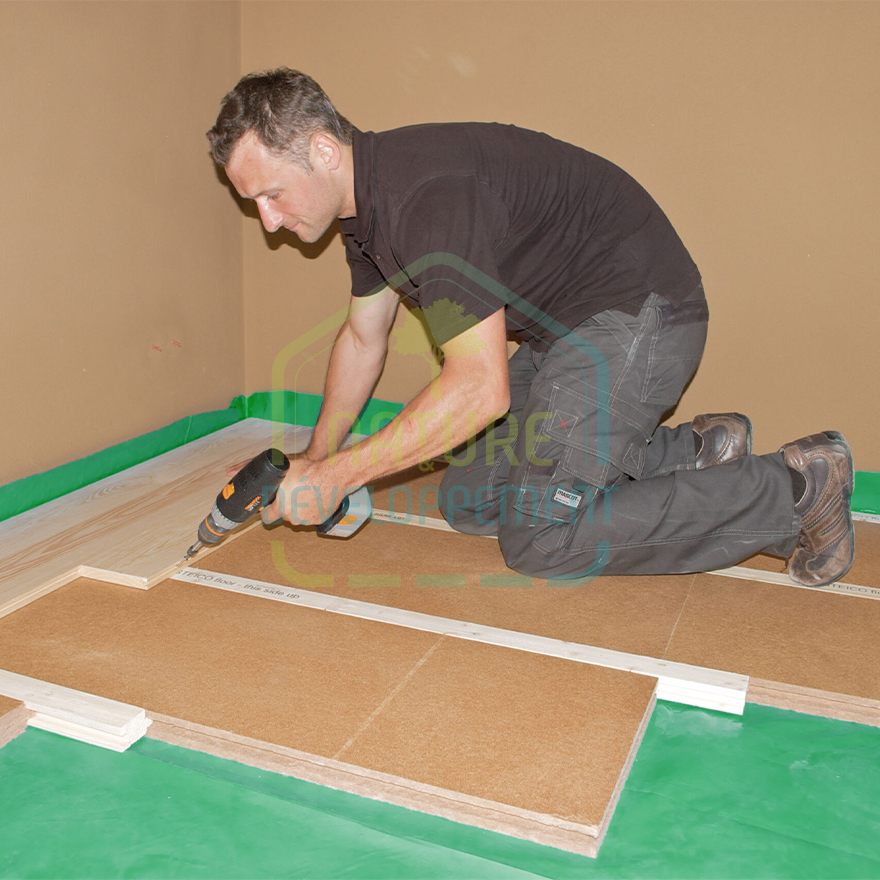 Les lambourdes plus fine que l’isolant, ne touchent pas le sol et évite ainsi de transmettre les bruits d’impact dans les planchers ou les solives.