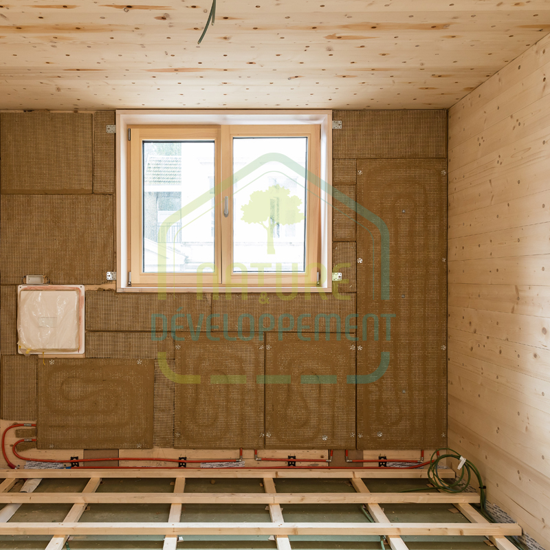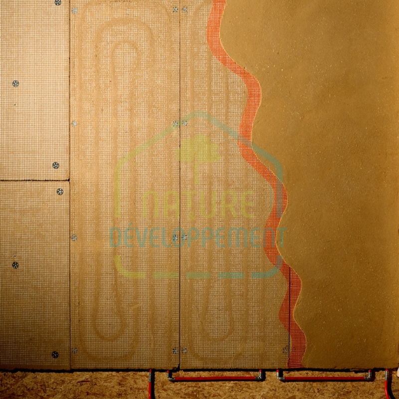 Le composant central du système de cloisons sèches chauffantes et/ou rafraîchissantes est un panneau d’argile de 25mm d’épaisseur avec des tuyaux de chauffage intégrés.