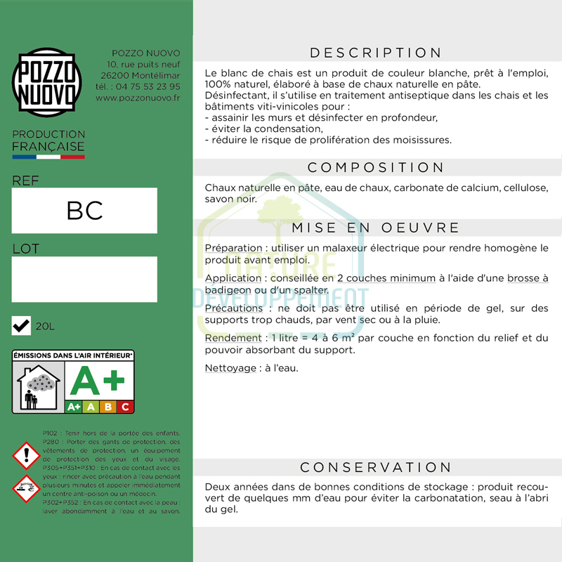 Ce badigeon » blanc de chais » de couleur ivoire s’utilise dans les chais, il est préparé à base de chaux en pâte , entièrement naturelle et prête à être utilisée.