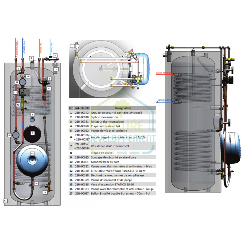 - un échangeur d’appoint en partie haute (pour appoint gaz, fioul, bois…).