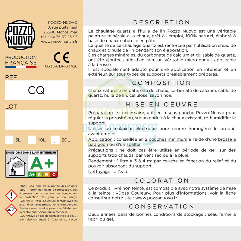 Composition « Chaulage quartz » : Chaux naturelle en pâte, sables de quartz, carbonate de calcium, eau de chaux, huile de lin, cellulose, savon noir.