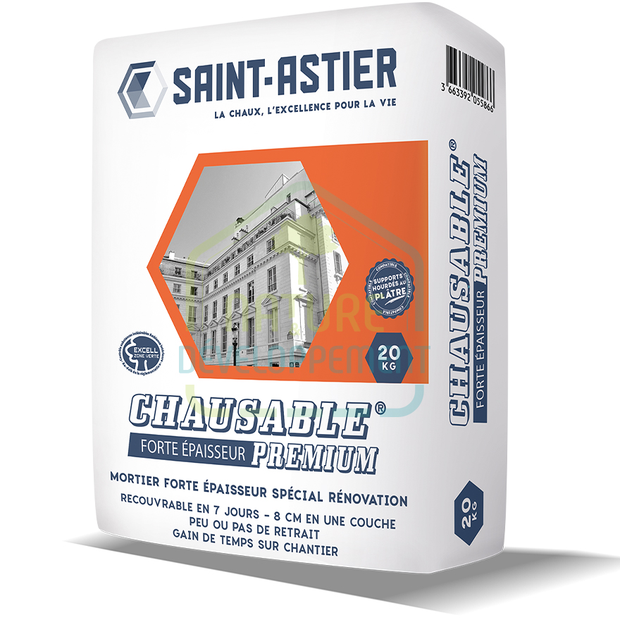 Le CHAUSABLE Mortier Chaux Prêt à l’Emploi de Saint-Astier est conçu pour la rénovation des bâtiments anciens. Ce mortier est idéal pour le dressage et la réalisation de sous-enduits. Sa composition unique à base de Chaux Hydraulique pour le CHAUSABLE, et de Chaux Pure Blanche LC**** NHL 3,5 pour le CHAUSABLE Prémium, assure souplesse et maniabilité. Il est adapté aux supports anciens, offrant une solution fiable et durable.