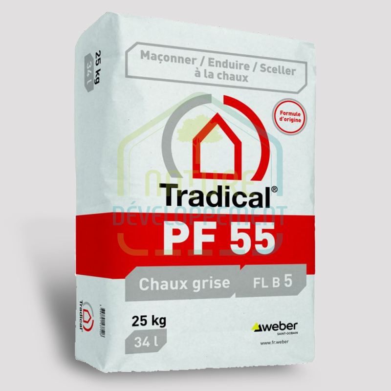 Tradical PF55 est un liant formulé à base de chaux aérienne (55 %), de liants hydraulique et pouzzolanique.