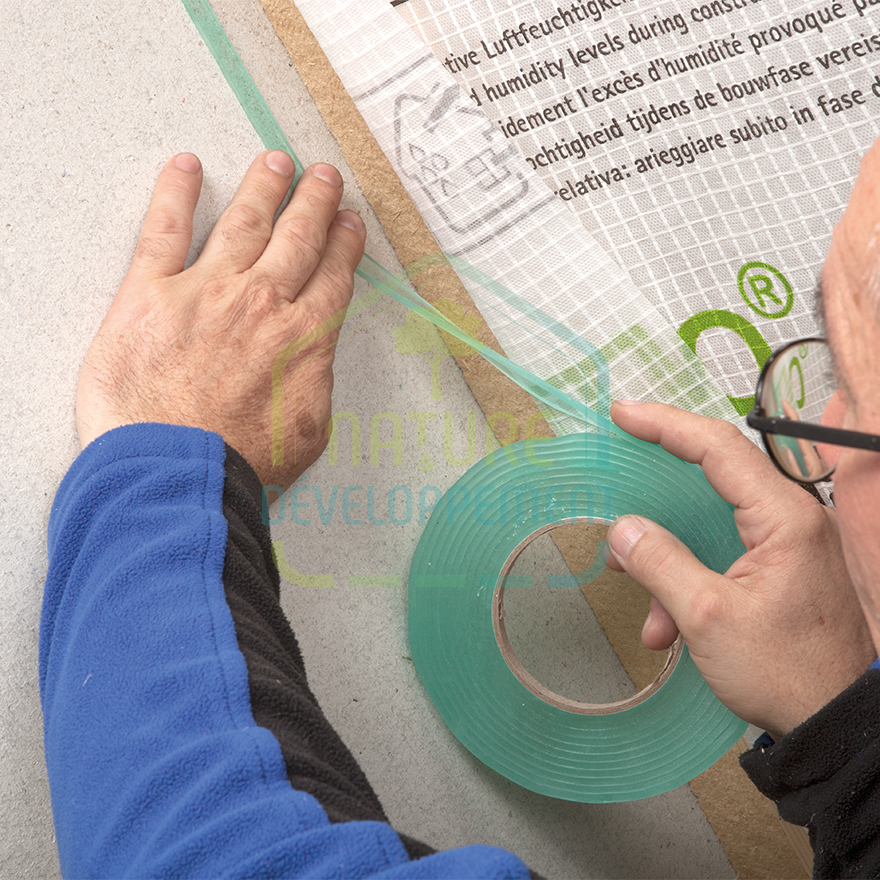 Elle est destinée au raccord de frein-vapeurs et de pare-vapeurs en tout genre, comme pro clima INTELLO, DB+, INTESANA, DASATOP et DA, ainsi que de films PE, PA, PP et aluminium à des éléments de construction adjacents minéraux et/ou rugueux (maçonnerie, enduit, béton, bois scié brut), conformément aux normes DIN 4108-7, SIA 180 et OENORM 8110-2.
