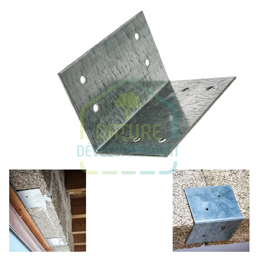 Les équerres se positionnent tous les 60cm au niveau de la jonction entre deux blocs de chanvre comme illustré sur la photo ci-contre. Il est impératif d’utiliser l’équerre adaptée à l’épaisseur du bloc de chanvre et d’utiliser des vis de diamètre 6mm au minimum pour la fixation de l’équerre dans le support. Après la pose du bloc sur l’équerre, il est nécessaire de les lier mécaniquement (vis, clou, etc.)*.
