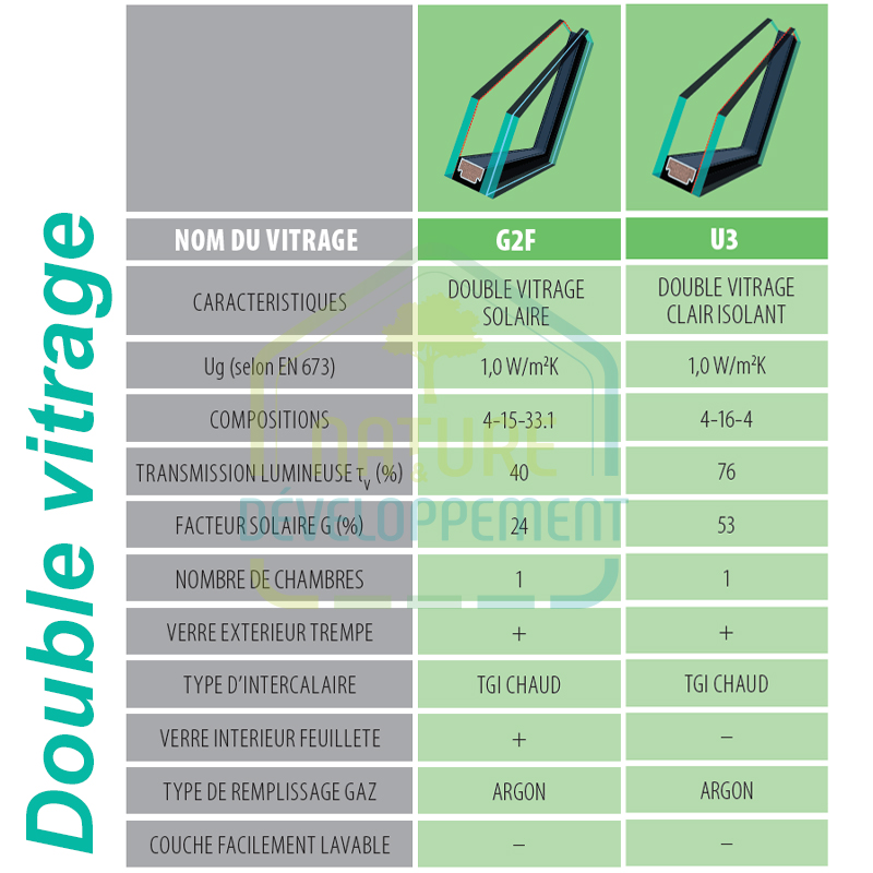 | Variante | Double vitrage clair isolant U3, Double vitrage solaire G2F, Triple vitrage clair isolant U5, Triple vitrage clair U4 |