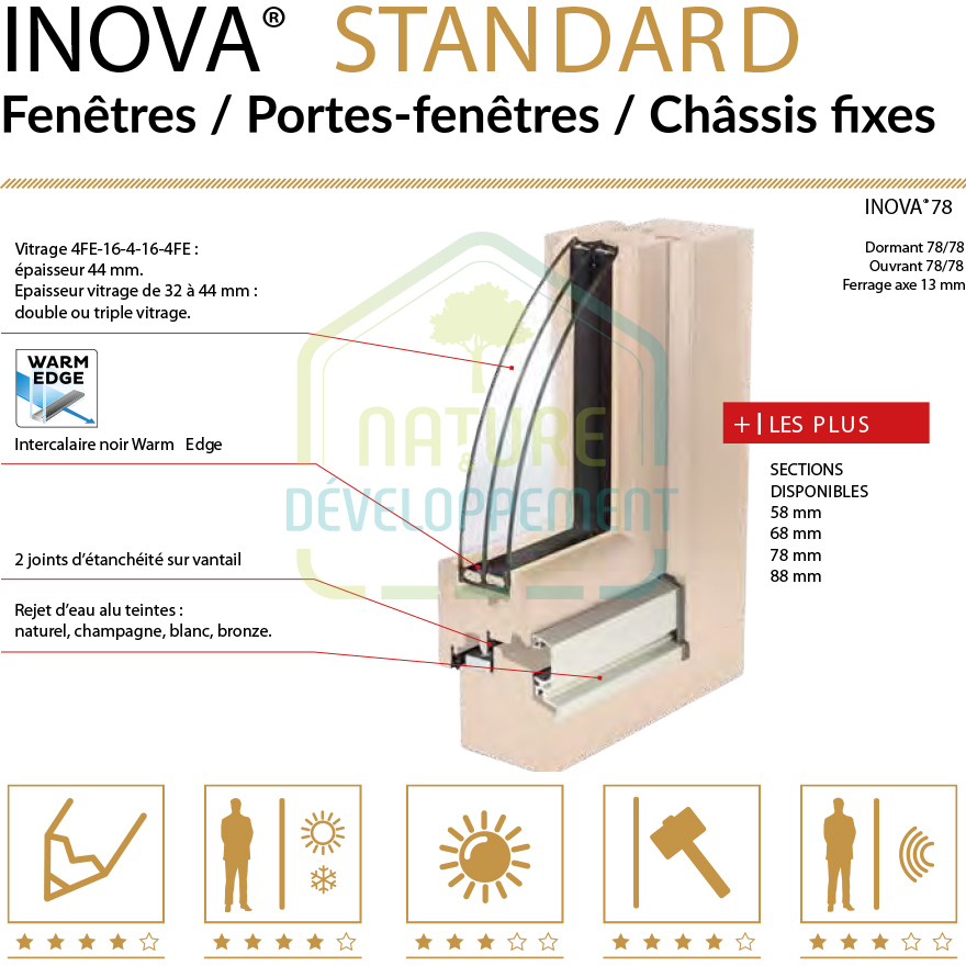 | Profil | Dormant 58, double vitrage., Dormant 68, double vitrage., Dormant 78, triple vitrage., Dormant 88, triple vitrage. |