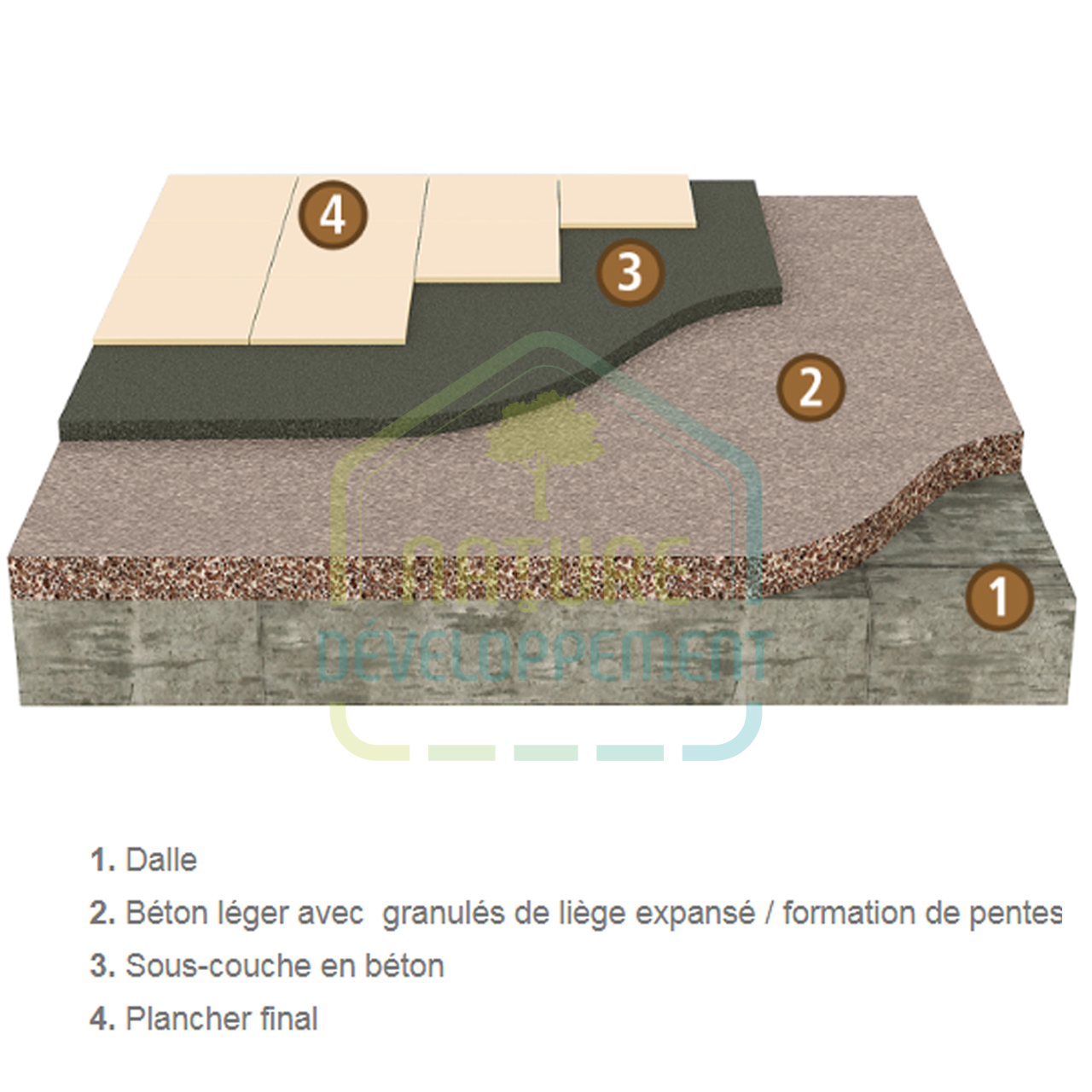- Incorporation dans le béton (bétons légers) qui assurent l’allègement des planchers d’habitation et des toitures avec des avantages thermiques et acoustiques
