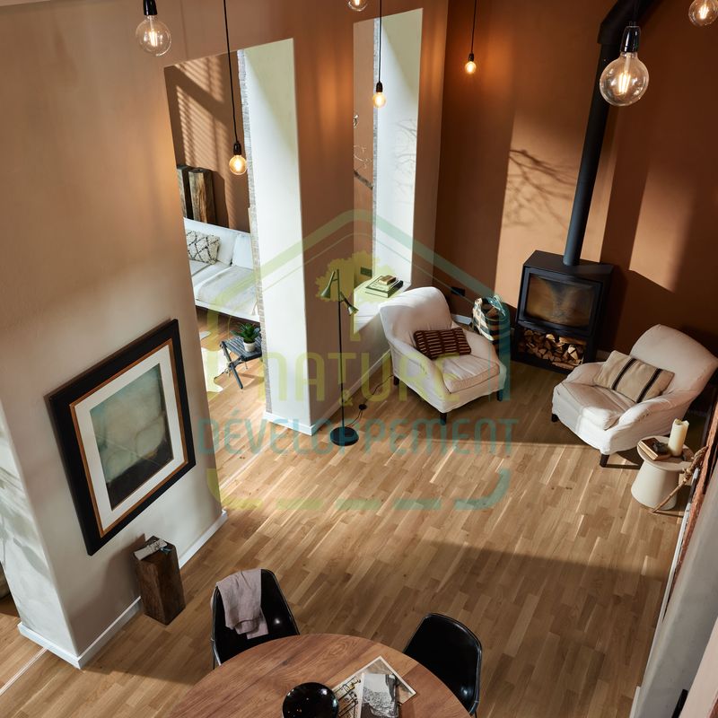 La finition en vernis ultra-mat du parquet humidifie chaque pore du bois, donnant aux lames un aspect noble et naturel.