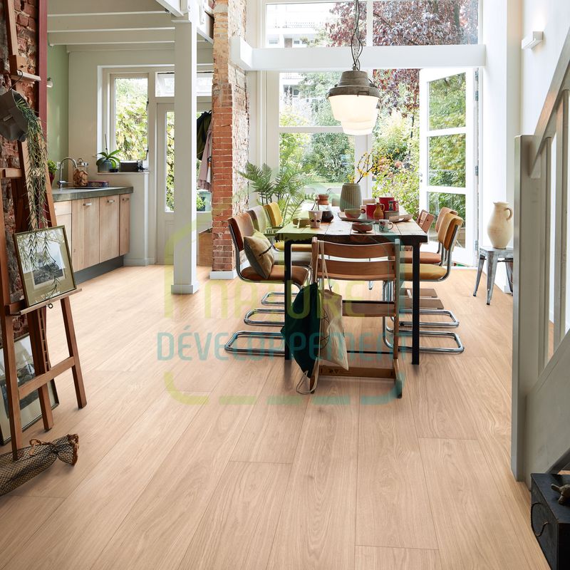 De plus, ce parquet bénéficie d’une résistance à l’eau de 4 heures, ce qui en fait un choix idéal pour les pièces humides, telles que les salles de bains.