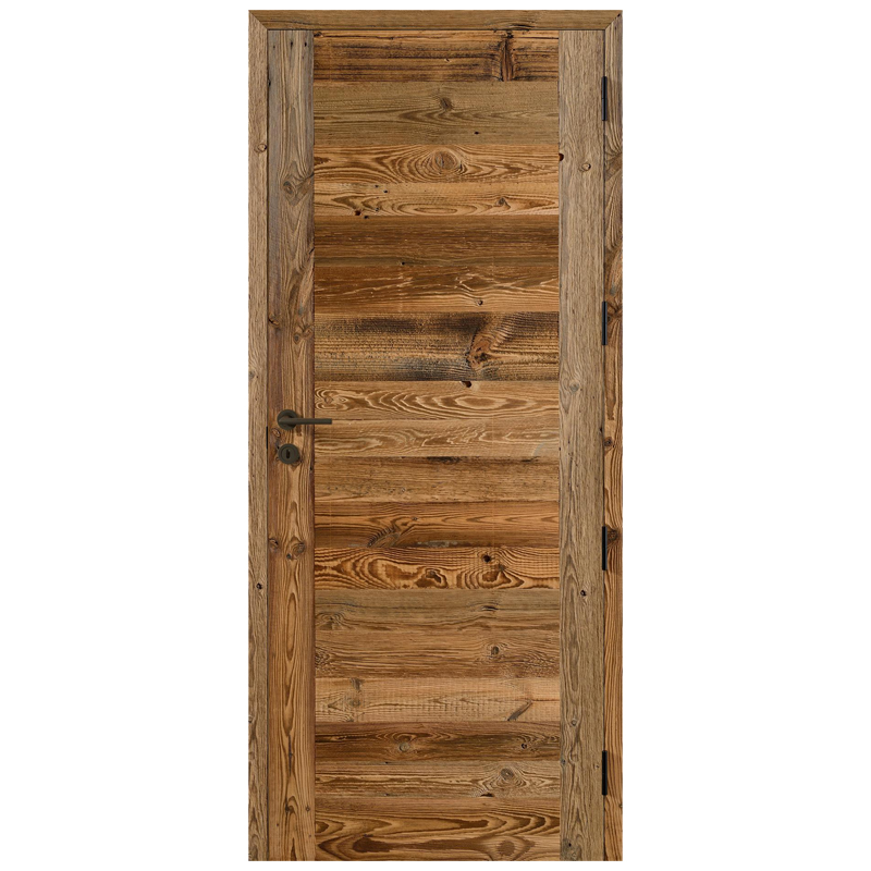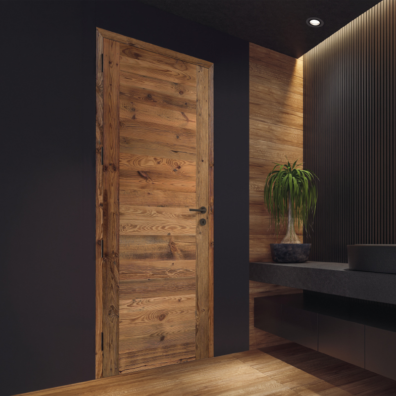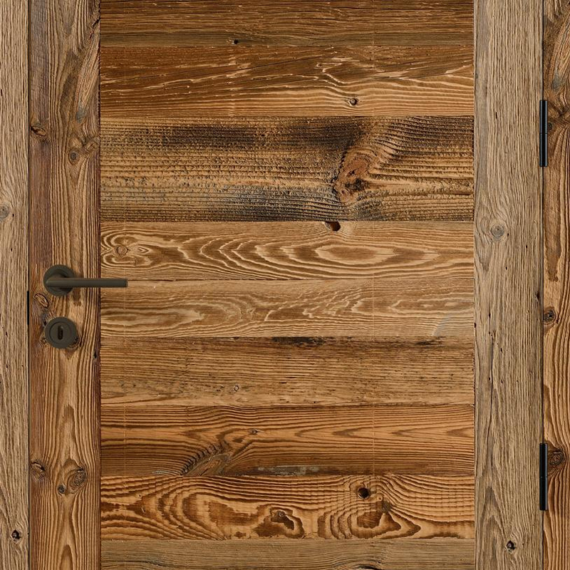 La porte intérieure Rozière Bréva Vieux Bois apporte un cachet immédiat. Son parement provient de bardages de chalets démontés.