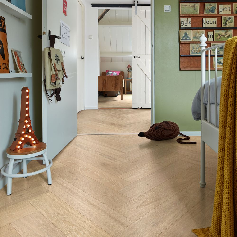 Les nouveaux sols en bois Lindura HS 500, en pose à bâton rompus, sont élégant et tendance et mettent en valeur toutes les pièces même les plus généreuses .
