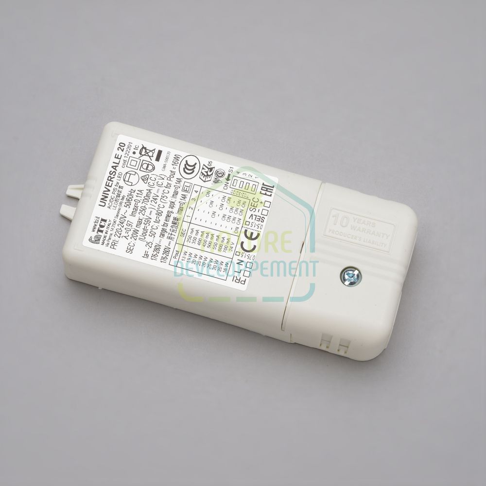 Ses caractéristiques techniques sont : alimentation CC fixe, puissance 20W, tension de sortie de 2 à 54V, ses dimensions 120x52x22.