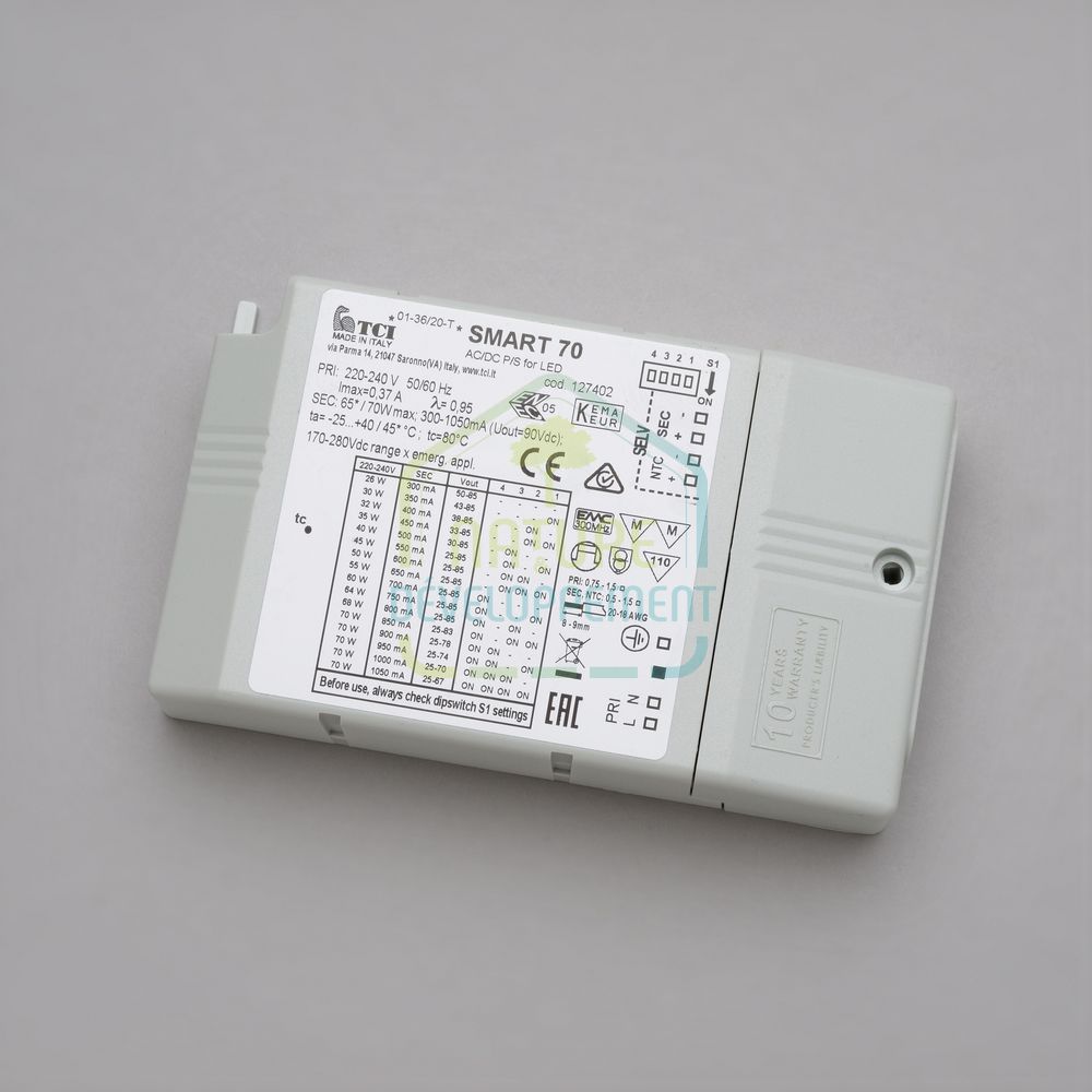 Ses caractéristiques techniques sont : alimentation CC fixe, puissance 60W, tension de sortie de 30 à 85V, ses dimensions 129x76x30.