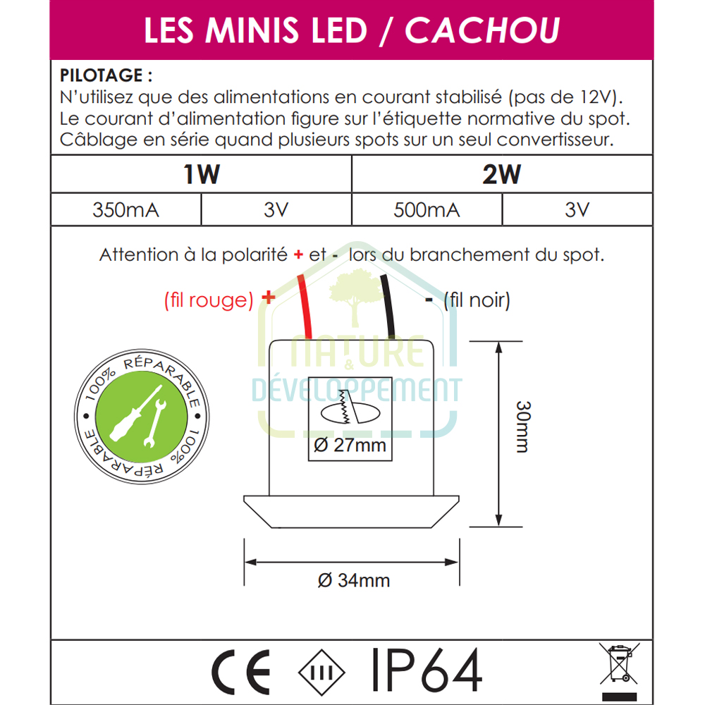 Les spots sous format unitaires doivent être pilotés avec un convertisseur de courant continu de 500mA.