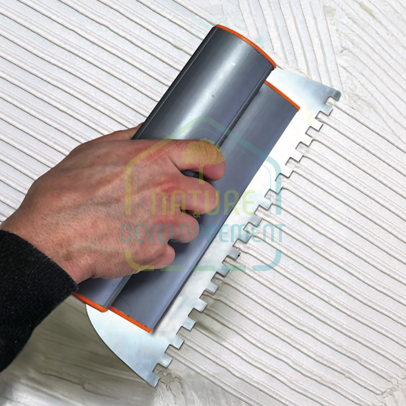 - Application de la colle : Étalez la colle uniformément en un seul passage grâce à la poignée ergonomique et la lame bien fixée.