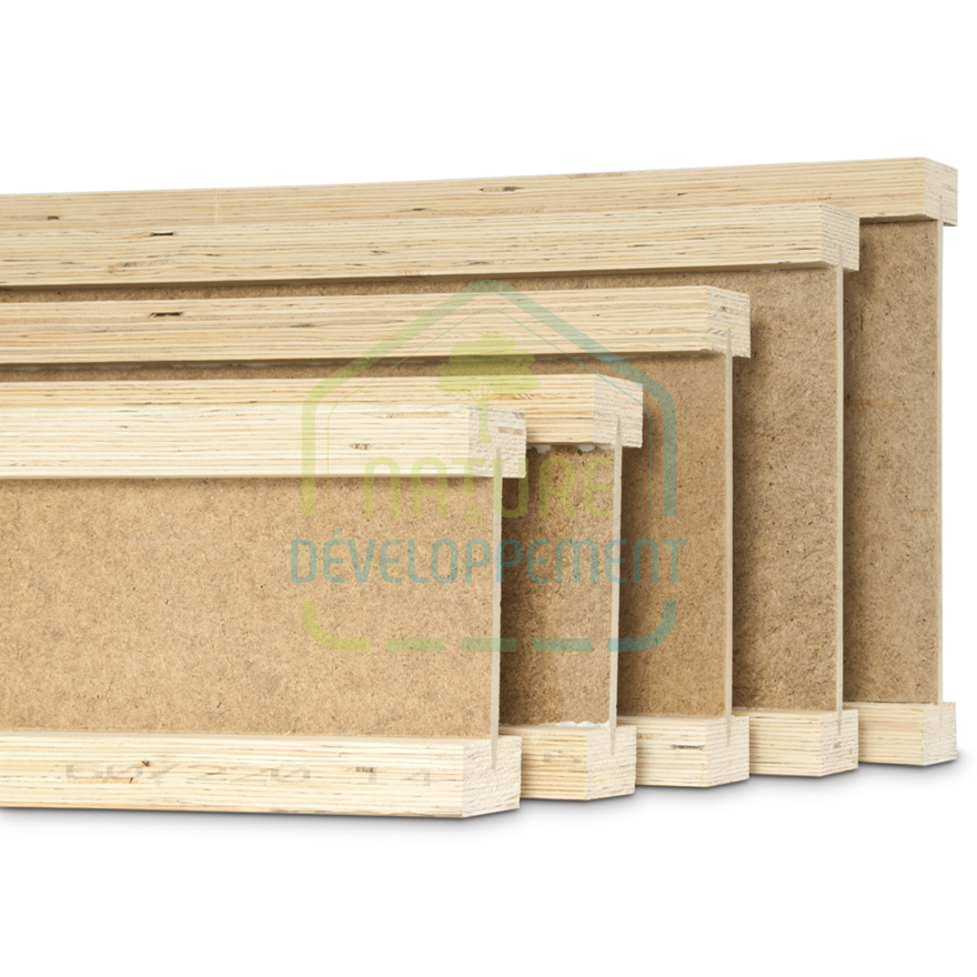 Dans une poutre en I, le bois massif va être utilisé là où il est le plus efficace, c’est-à-dire en haut et en bas de la poutre. L’âme de la poutre est constituée du panneau dérivé du bois, il assure la liaison entre la pièce du haut et celle du bas et a une plus grande résistance au cisaillement que le bois massif, de ce fait on peut obtenir des poutres très résistantes sur des longues portée jusqu’a 13,5m et aisément tranportables par leur légèreté qui ne nécessitent pas de matériel de levage important sur le chantier.