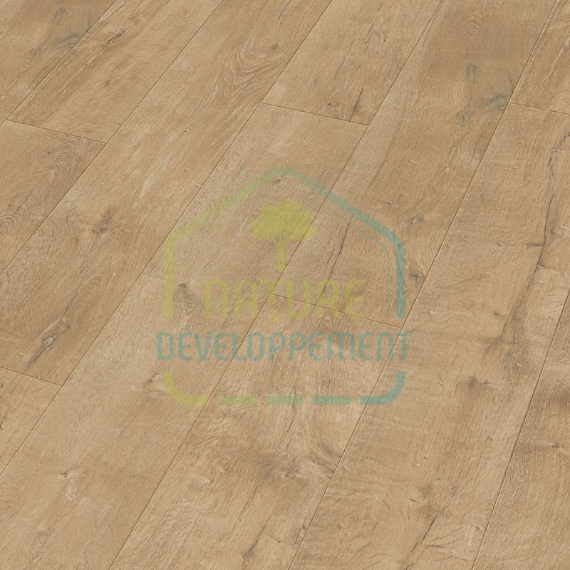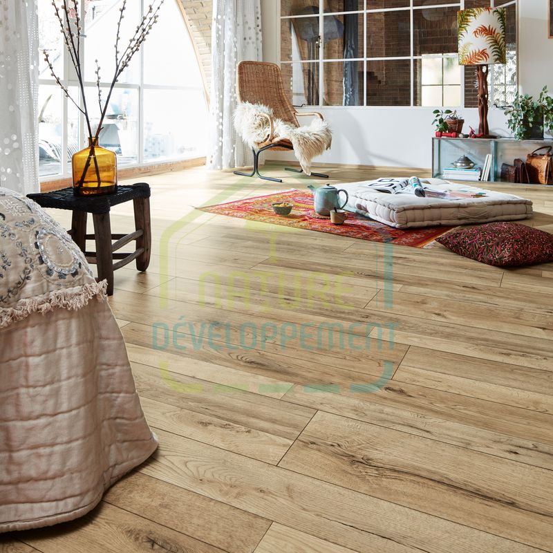 Le sol stratifié peut être facilement posé grâce au système d’assemblage (par clic) et convainc par ses détails optiques raffinés comme un micro-chanfrein périphérique.