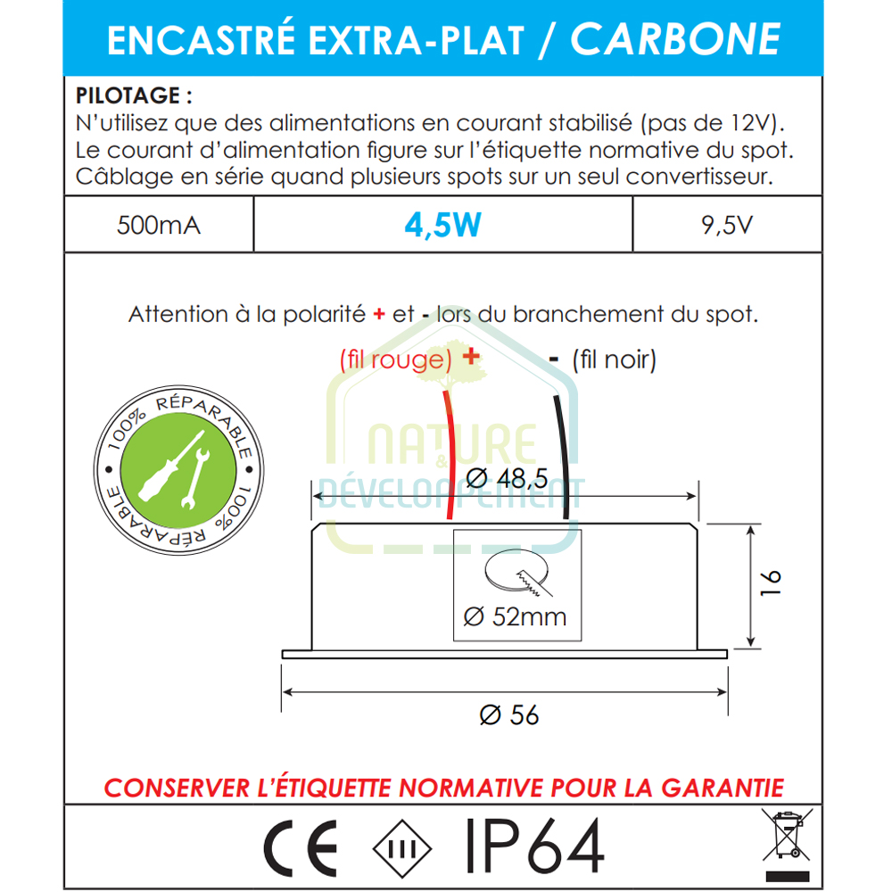 Prévoir une alimentation courant continu 500mA pour plusieurs spots câblés en série.