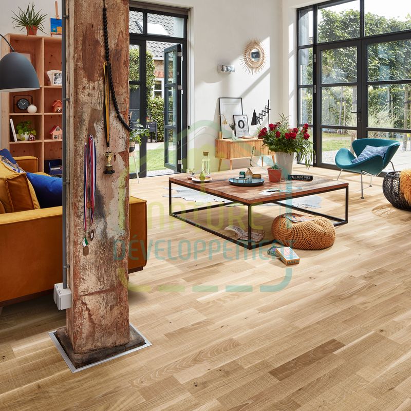 La finition en vernis ultra-mat du parquet humidifie chaque pore du bois, donnant aux lames un aspect noble et naturel.