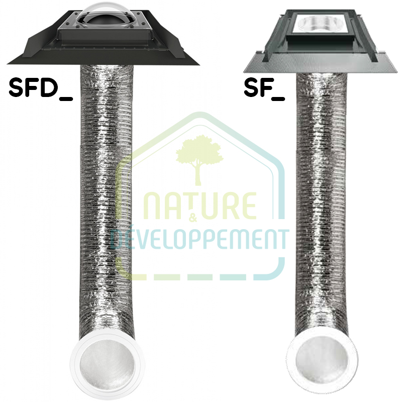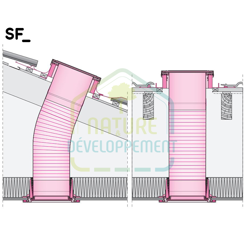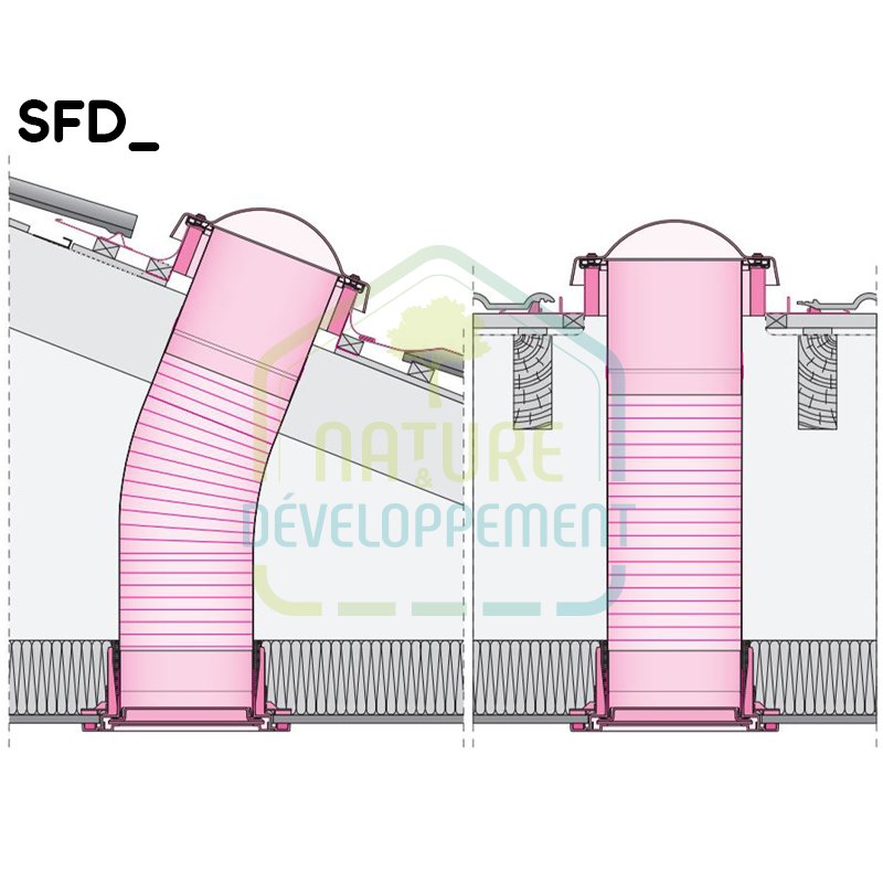 | Variantes | SFD-H avec coupole pour matériaux ondulés, SFD-S avec coupole pour matériaux plats, SFH avec verre plan trempé de 4mm pour matériaux ondulés, SFS avec verre plan trempé de 4mm pour matériaux plats |