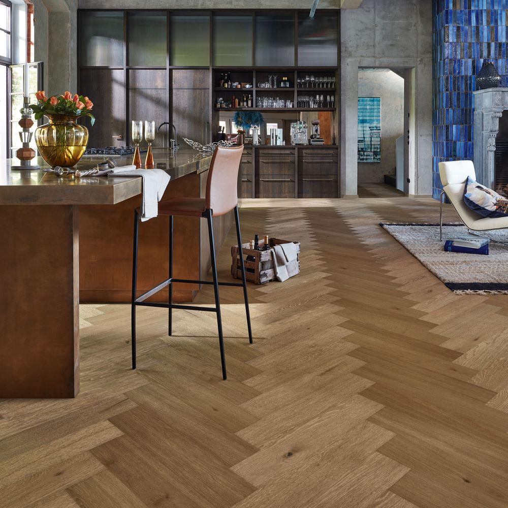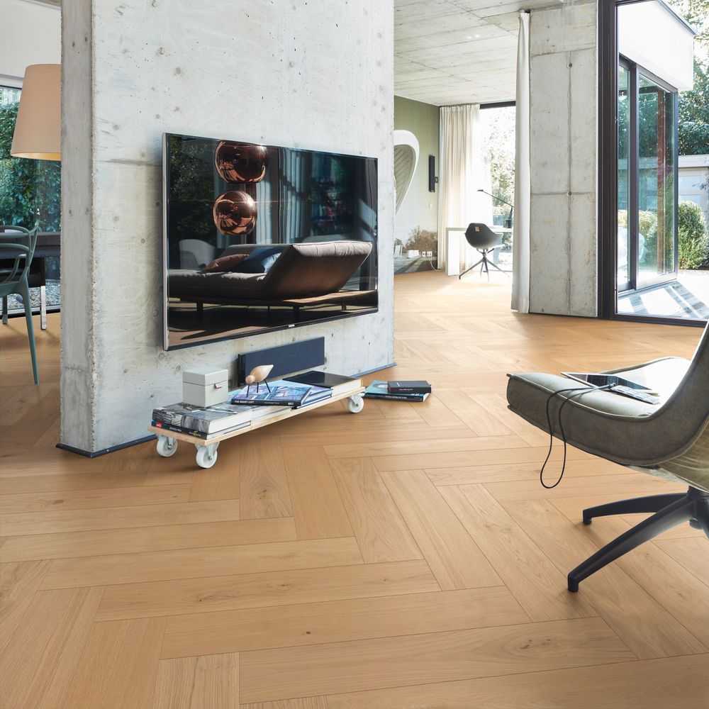 Les nouveaux sols en bois Lindura HS 500, en pose à bâton rompus, sont élégant et tendance et mettent en valeur toutes les pièces même les plus généreuses .