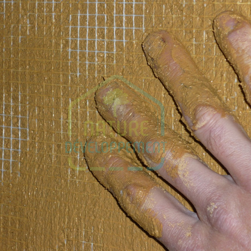 Après avoir appliqué un enduit Torchis ou Monocouche ARGILUS, la toile de jute est mise en œuvre sur l’enduit encore frais.